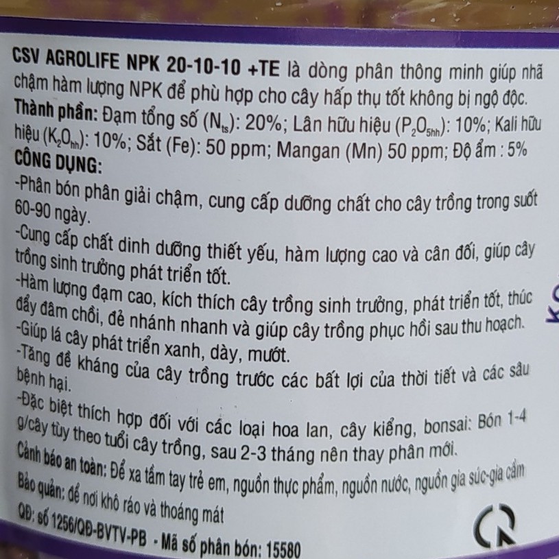 Phân bón tan chậm thông minh Hàn Quốc 20-10-10 TECSV AGROLIFE NPK 20-10-10+TE là dòng phân thông minh giúp nhã chậm hàm lượng NPK để phù hợp cho cây trồng hấp thụ tốt không bị ngộ độc.