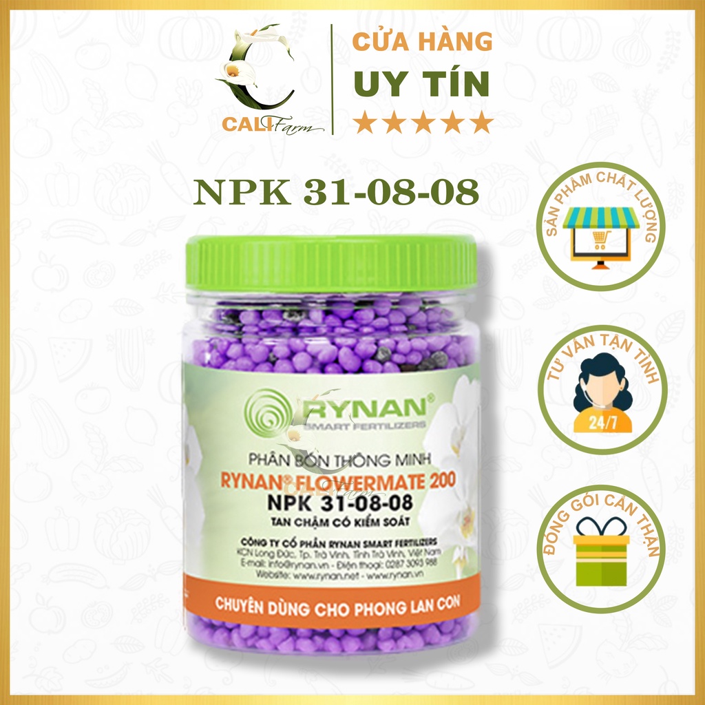 RYNAN® FLOWERMATE 200 là dòng sản phẩm phân bón thông minh tan chậm có kiểm soát chuyên dùng cho hoa phong lan. Cung cấp đầy đủ dưỡng chất cần thiết ở giai đoạn cây con, thời gian cung cấp dưỡng chất lên đến 120 ngày. Giúp cây sinh trưởng khỏe mạnh, tăng sức đề kháng, hạn chế nấm bệnh, kích thích mọc mầm, phát triển thân lá.👉 Thành phần: Ntt: 31%, P2O5hh: 8 %, K2Ohh: 8 %