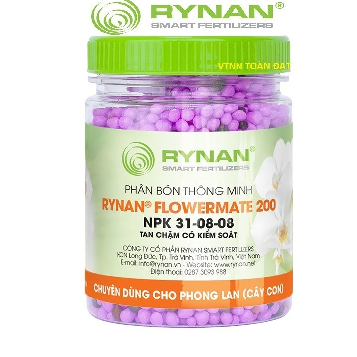 Phân Bón Thông Minh Tan Chậm Rynan RYNAN FLOWERMATE 200 chuyên cho cây lan con, cây sinh trưởng nhanh hơn, rút ngắn thời gian sinh trưởng để thời gian ra hoa của cây nhanh hơn. Cung cấp dưỡng chất giúp cây phát triển tốt trong 120 ngày với chỉ 1 lần bón.