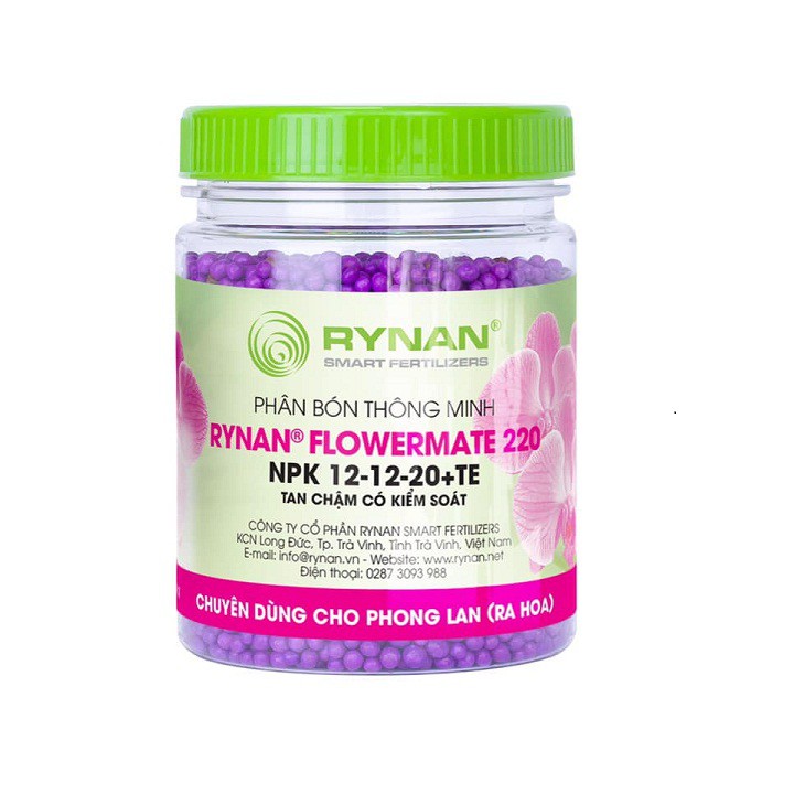 Phân tan chậm thông minh Rynan Flowermate 220 NPK 12-12-20 TE hũ 150g chuyên dùng cho các loại Phong Lan đang ra hoaQuy cách đóng gói: Hũ 150g