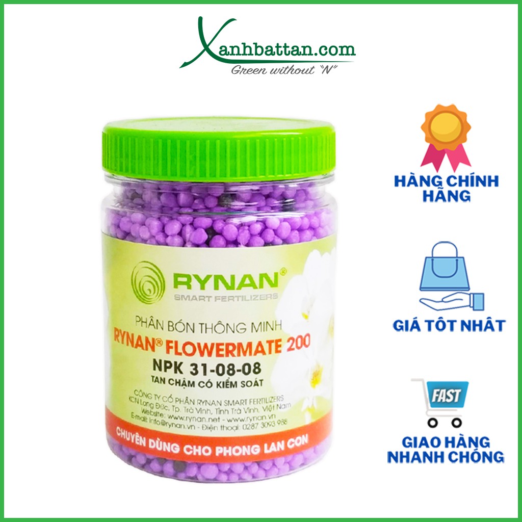Phân Tan Chậm Rynan Flowermate 200Phân Bón Rynan 200 là dòng phân bón vô cơ, dòng sản phẩm được sản xuất theo công nghệ tiến tiến với lớp màng polymer bao bọc giúp kiểm soát việc giải phóng dinh dưỡng hiệu quả và theo nhu cầu của cây trồng. Phân bón Rynan Flowermate 200 có hàm lượng khoáng N-P-K lần lượng là 31%, 8% và 8% và hàm lượng chitosan được bổ sung giúp cho phong lan sinh trưởng mạnh, giúp cây con sinh trưởng và phát triển, chồi và lá sinh trưởng mạnh.
