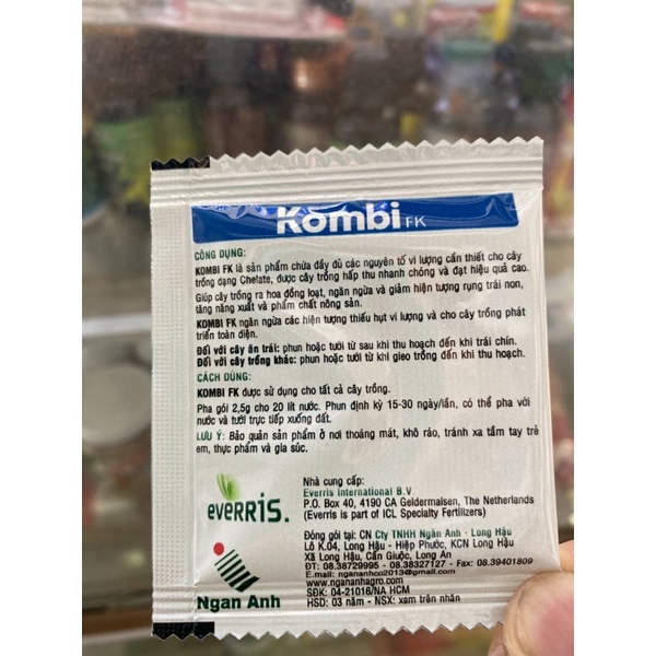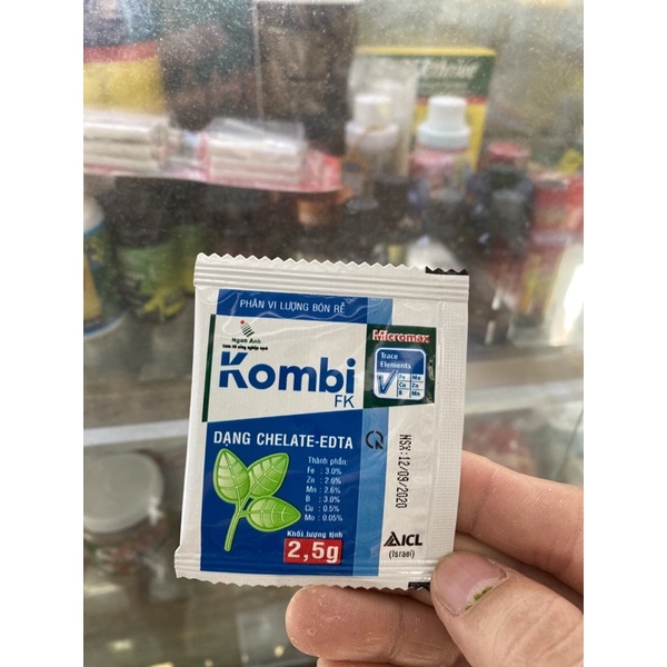 Phân vi lượng bón rễ Kombi FK 2,5gr Dạng Chelate EDTA* Thành phần: Vi lượng dưới dạng Chelate-Edta giúp cây trồng dễ hấp thụ hơn: