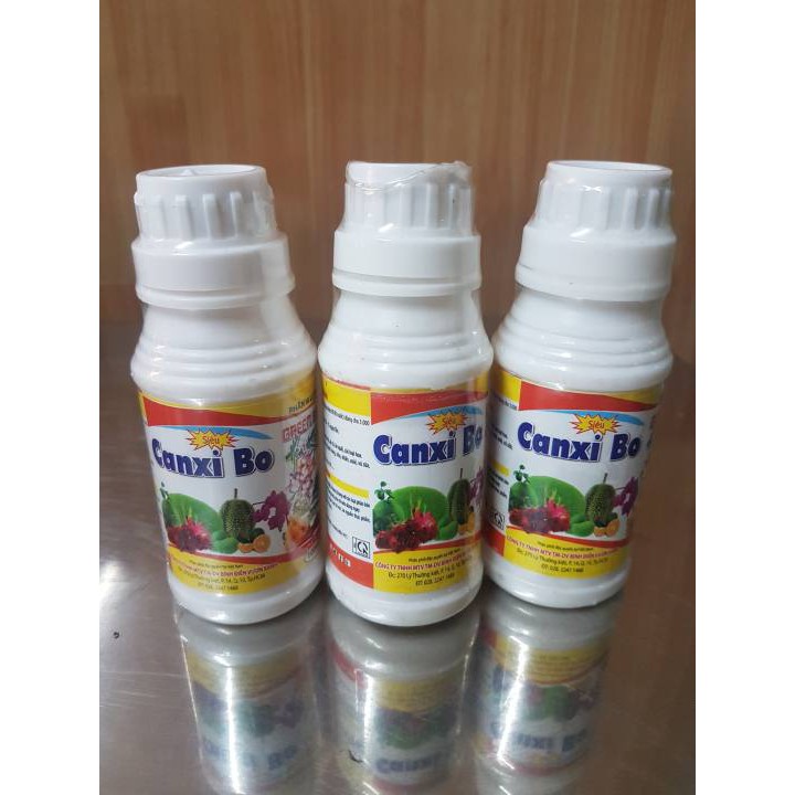 Phân bón vi lượng CANXI BO 100mlThành phần: Bo: 10.000ppm, Ca: 5%, PH:5, tỷ trọng 1,1. Bổ dung vi lượng TE (Fe, Mg, Cu, Zn, Si,...) và các phụ gia sinh học đặc hiệu khác.