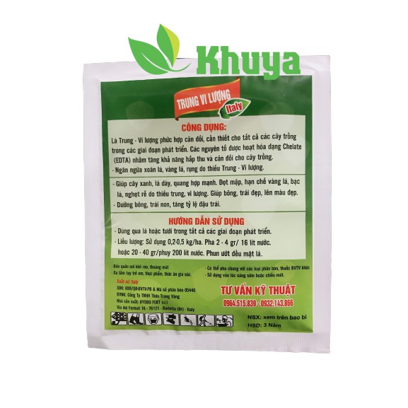 - Là Trung, vi lượng phức hợp cân đối, cần thiết cho tất cả các cây trồng trong các giai đoạn phát triển. Các nguyên tố được hoạt hóa dạng Chelate (EDTA) nhầm tăng khả năng hấp thu và cân đối cho cây trồng.