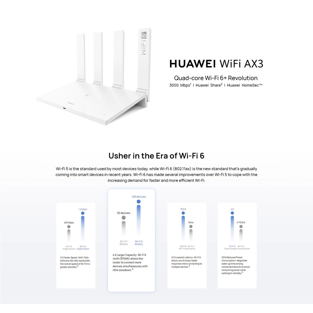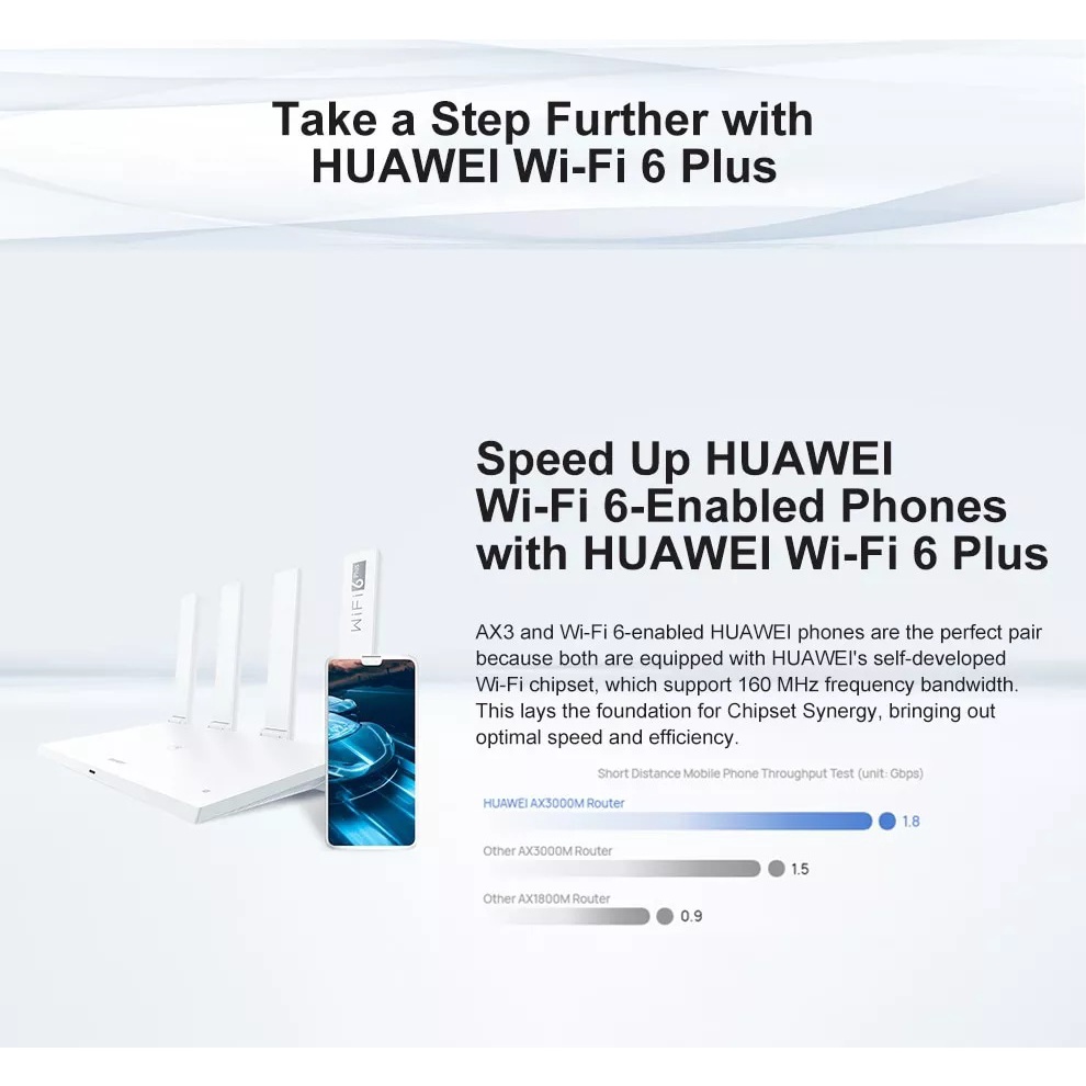 APP: HUAWEI AI Life App , Huawei Share (Tap to Connect), Huawei HiLink & 802.11v protocol, IPv4 / IPv6, PPPoE / DHCP / static IP address / Bridge WAN connection methods, Wi-Fi timer, Guest Wi-Fi, Device speed limiting, MAC address filter, Parental control, VPN pass through, DMZ / virtual server…