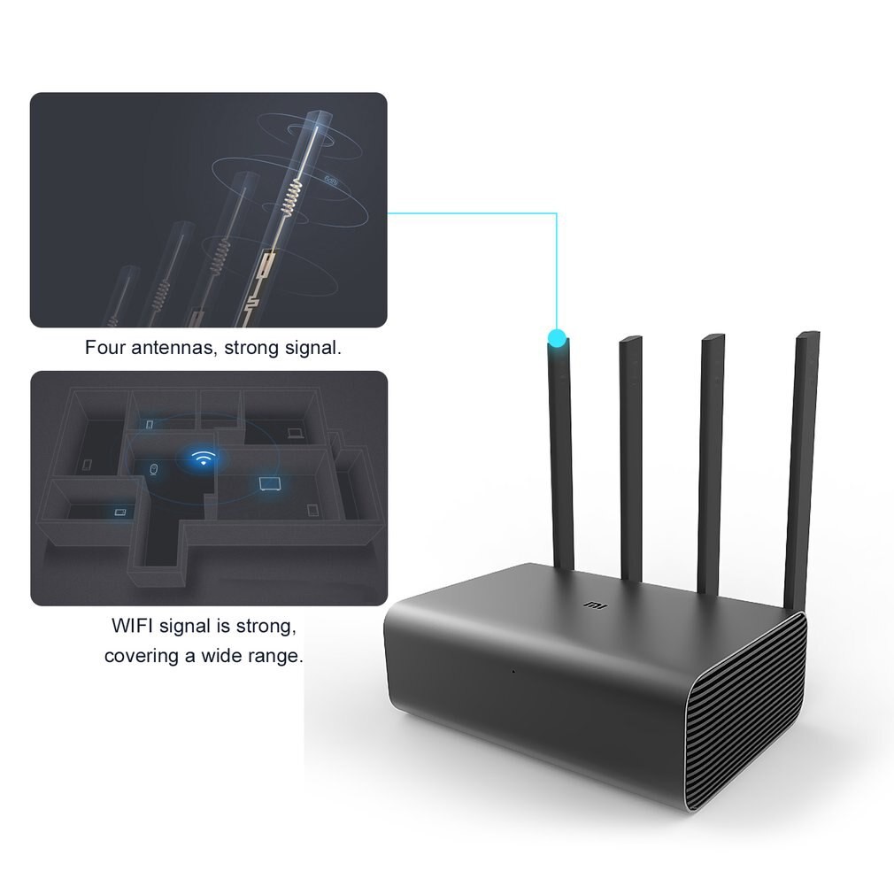 ✔ Chiếc Mi Router Pro trang bị WiFi ac, băng tần kép 2.4Ghz và 5Ghz, 4 ăng ten PCB độ nhạy cao, hỗ trợ công nghệ 4×4 MU-MMO, vỏ nhôm, băng thông tối đa 2600Mbps