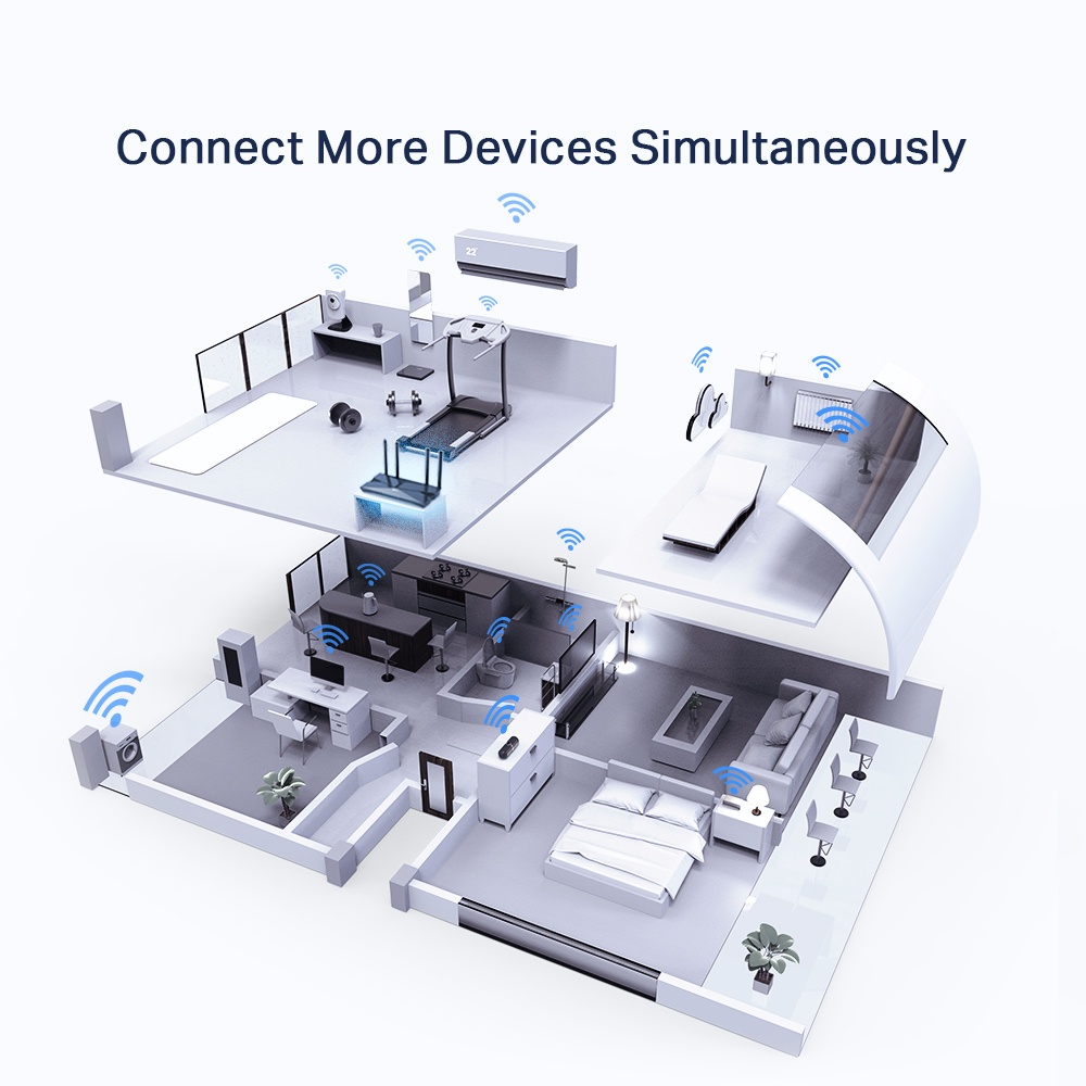 Kết nối nhiều thiết bị hơn—Công nghệ OFDMA tăng hiệu năng lên 4 lần, cho phép truyền tải đến nhiều thiết bị hơn.