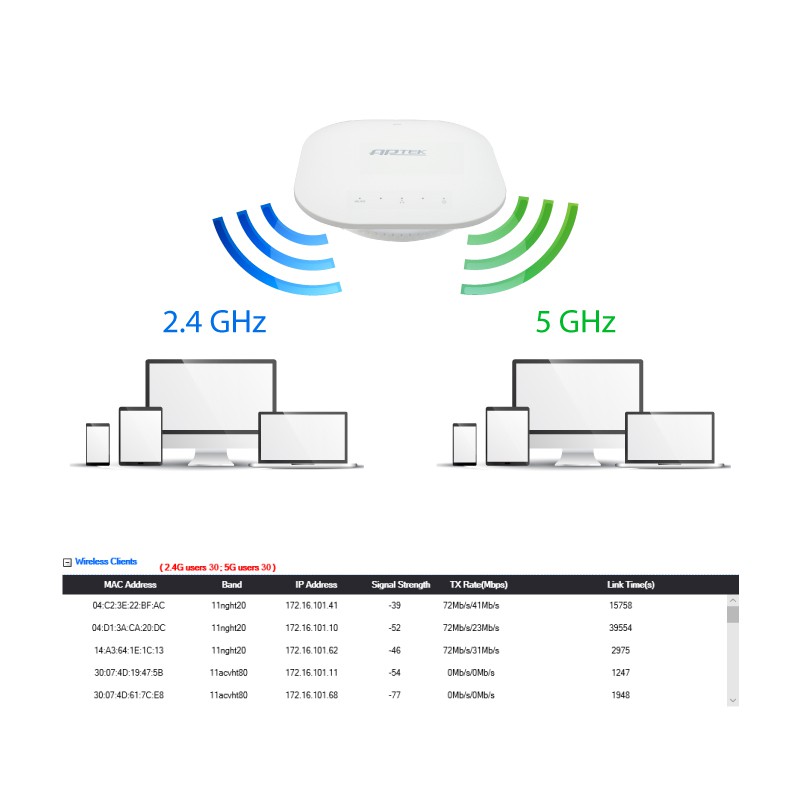 - Cho phép 60 thiết bị kết nối đồng thời: Bộ phát Wi-Fi APTEK AC752P cho phép 60 thiết bị kết nối đồng thời trên 2 băng tần 2.4GHz và 5GHz.