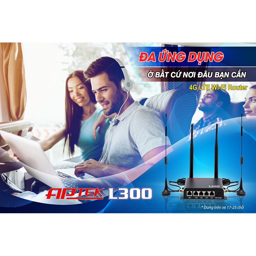 4G Wi-Fi Router APTEK L300 băng thông rộng với khe cắm thẻ SIM 4G/LTE, thích hợp triển khai internet trên xe khách, hội chợ triễn lãm...Modem tích hợp tính năng LTE, với khe sim thích hợp với tất cả các nhà mạng.