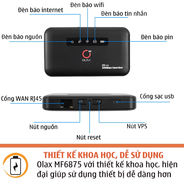 👉Bộ Phát Wifi 4G Di Động Olax MF6875 Tốc Độ 300Mb , Hỗ trợ 1 Cổng LAN, Pin 2600mAh, Hỗ Trợ Kết Nối 32 Thiết BịThiết bị phát wifi di động cầm tay đang là thiết bị không thể thiếu với mỗi cá nhân khi sống trong thời đại 4.0 khi mọi hoạt động như công việc, học tập, giải trí, liên lạc, … đều có sự tham gia của internet. Olax MF6875 là bộ định tuyến 4G tốc độ truyền tải wifi lên đến 300 Mbps, pin 2600 mAh hỗ trợ thời gian duyệt web lên đến 12 giờ, công nghệ MIMO hỗ trợ tối đa 32 người dùng và tương thích với tất cả các nhà mạng ở Việt Nam. Bạn hoàn toàn có thể yên tâm về chất lượng cũng như công nghệ được trang bị trong chiếc Olax MF6875 này.