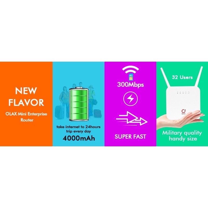 Bộ Router Phát Wifi Olax Ax6 Pro B có thể sử dụng sim 3G, 4G của tất cả các nhà mang công suất phát lên đến 150MB cho phép bạn chơi game, xem phim mà không lo hiện tượng giật, lag ảnh hưởng đến quá trình sử dụng ( còn phụ thuộc vào dung lượng Sim nữa nha ace)