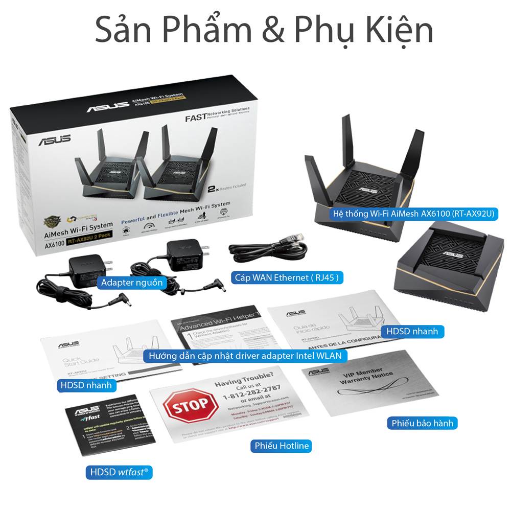 📌 Gói đi kèm: (RT-AX92U x1), (Cáp RJ-45 x1), (Thẻ Bảo hành x1), (QSG x1), (Bộ điều hợp N x1)
