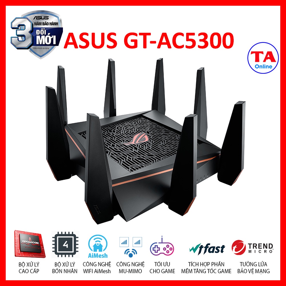 - Router WiFi Gaming AC5300 3 băng tần cho trải nghiệm thực tế ảo VR và truyền phát 4K, với bộ xử lý lõi tứ, cổng gaming, AiMesh cho khả năng kết hợp các hệ thống wifi, WTFast, Adaptive QoS và bảo vệ mạng AiProtection.