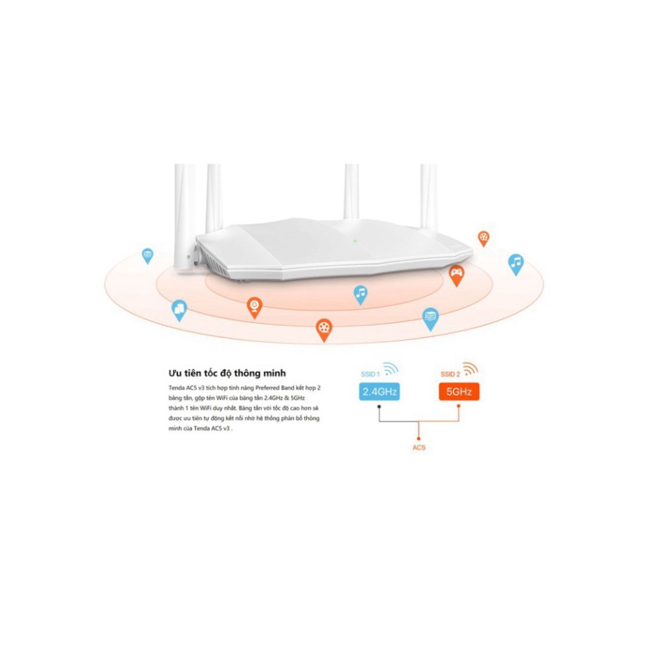 Tenda AC5 v3 tích hợp tính năng Preferred Band kết hợp 2 bằng tần, gộp tên WiFi của băng tần 2.4GHz & 5GHz thành 1 tên WiFi duy nhất. Băng tần với tốc độ cao hơn sẽ được ưu tiên tự động kết nối nhờ hệ thống phân bổ thông minh của Tenda AC5 v3.