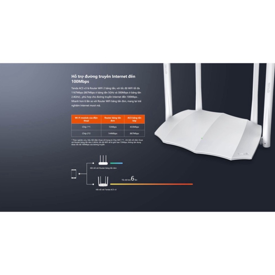 Tenda AC5 v3 là Router WIFi 2 băng tần, với tốc độ WiFi tối đa 1167Mbps (867Mbps ở băng tần 5GHz và 300Mbps ở băng tần 2.4GHz) , phù hợp cho đường truyền Internet đến 100Mbps . Nhanh hơn 6 lần so với Router WiFi băng tần đơn, mang lại trải nghiệm Internet mượt mà.
