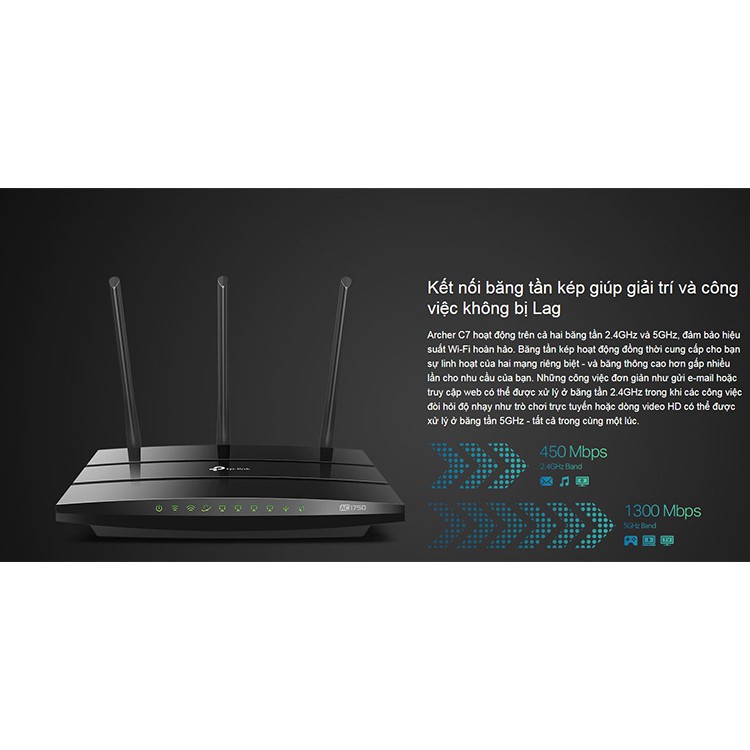 Với chuẩn Wi-Fi mới cho trải nghiện trực tuyến tuyệt vời hơn.Router Tplink Archer C7 - Hàng chính hãng là router chuẩn 802.11ac siêu nhanh với phạm vi phủ sóng đáng kinh ngạc. Archer C7 tốt hơn nhiều so với các router cùng loại có giá đắt gấp hai lần. Với chuẩn Wi-Fi nâng cao này router được thiết kế cho các hoạt động trực tuyến có lưu lượng truy cập cao và chạy các ứng dụng với tốc độ nhanh gấp ba lần chuẩn 802.11n trước. Kết nối băng tần kép giúp giải trí và công việc không bị Lag