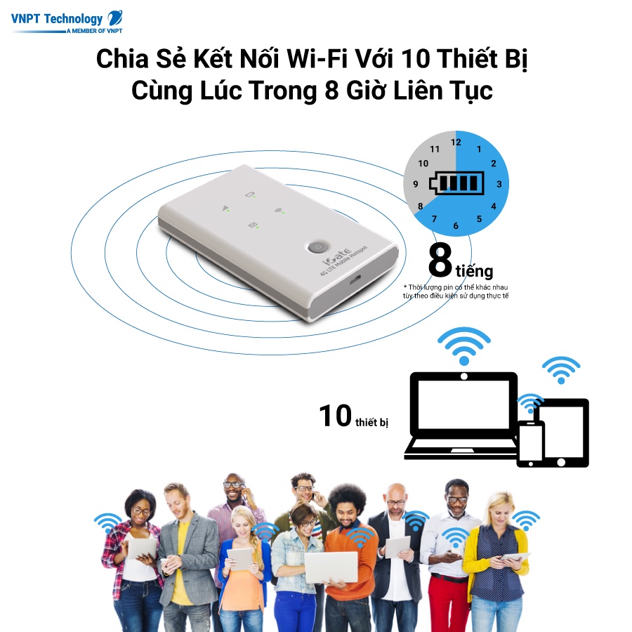lên tới 6 giờ (LTE), 8 giờ (UMTS). Sản phẩm được nghiên cứu, phát triển và sản xuất hoàn toàn tại Việt Nam, bởi VNPT Technology