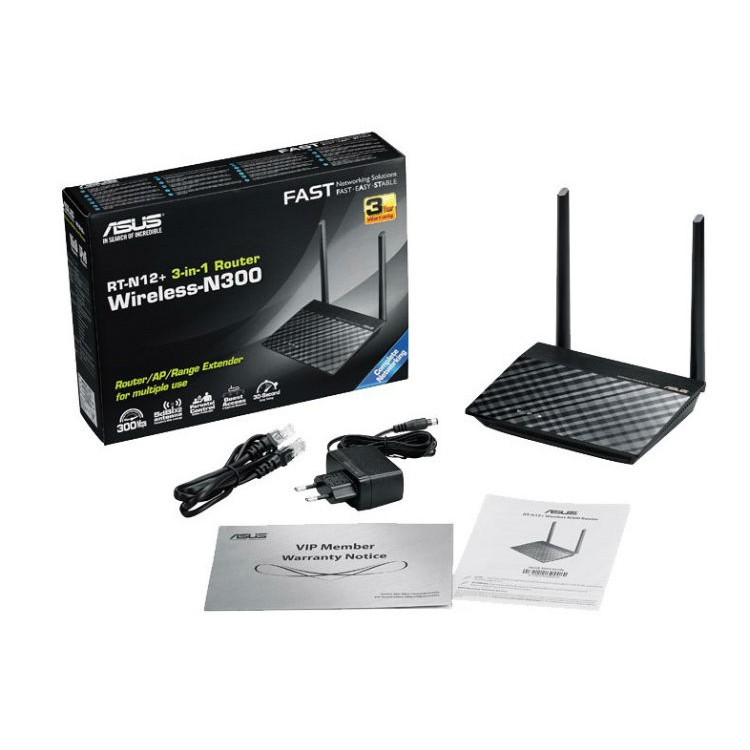 Router RT-N12+ x 1 Cáp RJ45 x 1 Phiếu bảo hành x 1 Nguồn điện x 1 *Nội dung gói thay đổi tùy theo yêu cầu địa phương của mỗi quốc gia