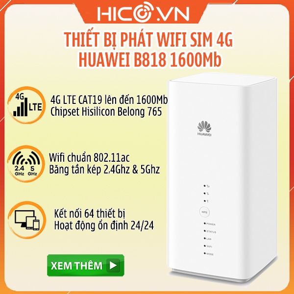 Giới thiệu Bộ Phát Wifi LTE Huawei B818 Tốc độ 1.6Gbps - Hỗ Trợ 64 Kết Nối - Wifi Chuẩn AC 1750Mbps - Băng Tần Kép