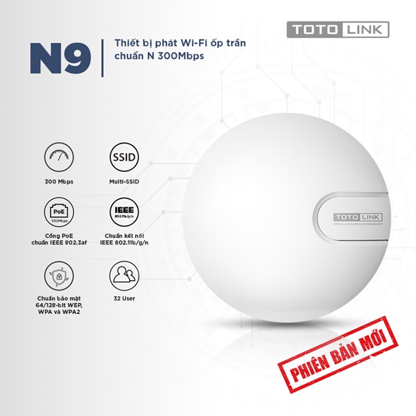 📍 Bộ phát wifi ốp trần Totolink N9 v2 - router ốp trần chuẩn N 300Mbps📌 Tương thích chuẩn IEEE 802.11 b/g/n