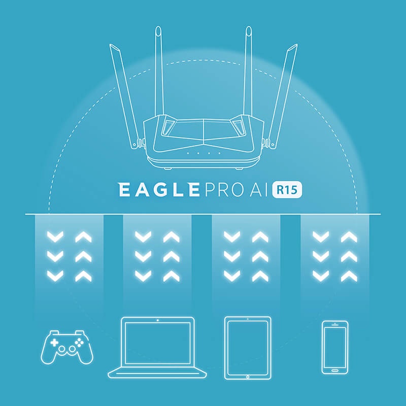 Smart Router Wi-fi D-Link Eagle Pro AI R15 được tích hợp chuẩn Wi-fi 6 tốc độ AX1500 2 băng tần, 4 anten phủ sóng lên đến 240 mét vuông, để bạn làm việc, xem phim, giải trí, chơi game, đàm thoại… cùng lúc mà không bị gián đoạn truy cập.