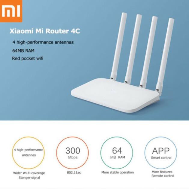 Bộ phát wifi Router Xiaomi 4C được phát hành giữa năm 2018. Với điểm mạnh là được rút gọn giá chỉ hơn phân nửa so với gen 4, đây chính là một bộ phát wifi “hộ gia đình” siêu ổn định với mức giá tầm trung hấp dẫn mà bạn không thể bỏ qua.Thông số Bộ phát wifi Router Xiaomi 4C