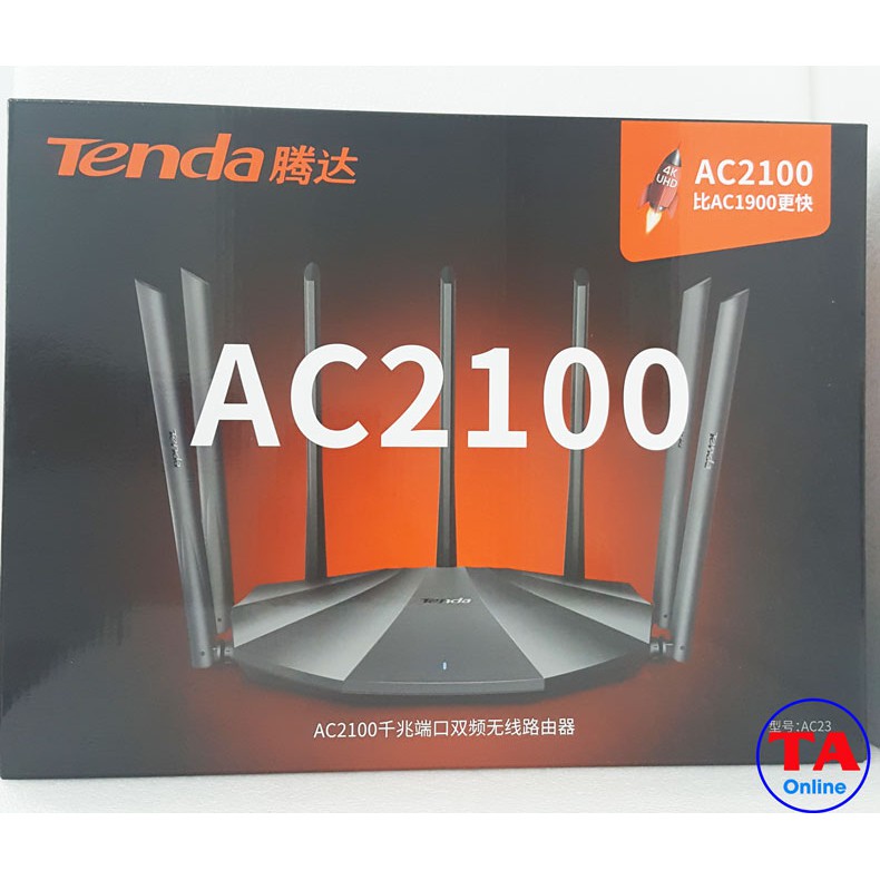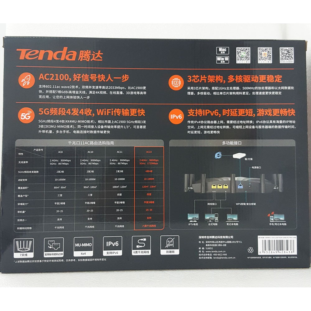 ▶️ BỘ PHÁT WIFI TENDA AC23, HAI BẰNG TẦN, TỐC ĐỘ 2100MBPS, 7 ANTEN 6DBI CHO KHẢ NĂNG PHỦ SÓNG MẠNH MẼ, CÓ REPEATER ▶️👉Tenda AC23 là sản phẩm Router Wifi được hãng Tenda ra mắt hướng tới hộ gia đình và doanh nghiệp có không gian rộng lớn, với tốc độ cao hỗ trợ 2 băng tần 2.4Ghz /5Ghz (1733Mbps cho băng tần 5Ghz và 300Mbps cho băng tần 2.4Ghz), chuẩn 802.11b/g/n/ac Wave 2 2100Mbps.