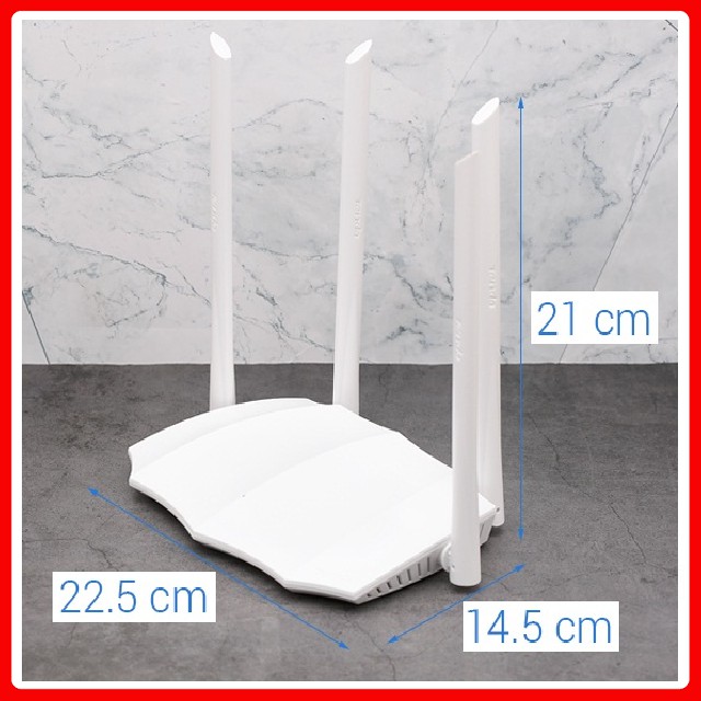 - Thiết bị mạng Router Tenda AC5 V3 được thiết kế với màu trắng sang trọng bắt mắt chiều dài 22.5cm và chiều rộng 14.5cm với 4 anten có chiều dài 21cm và tạo điểm nhấn với 4 đường uốn lượn vô cùng tinh tế, với thiết kế nhỏ gọn bạn có thể để ngay trên bàn làm việc mà không chiếm quá nhiều diện tích.