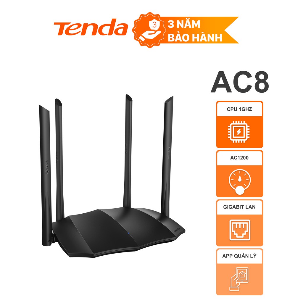 Router WiFi Tenda AC8 băng tần kép AC1200 full Gigabit - Bảo hành 3 năm - Hàng chính hãng📦 Sản phẩm bao gồm: