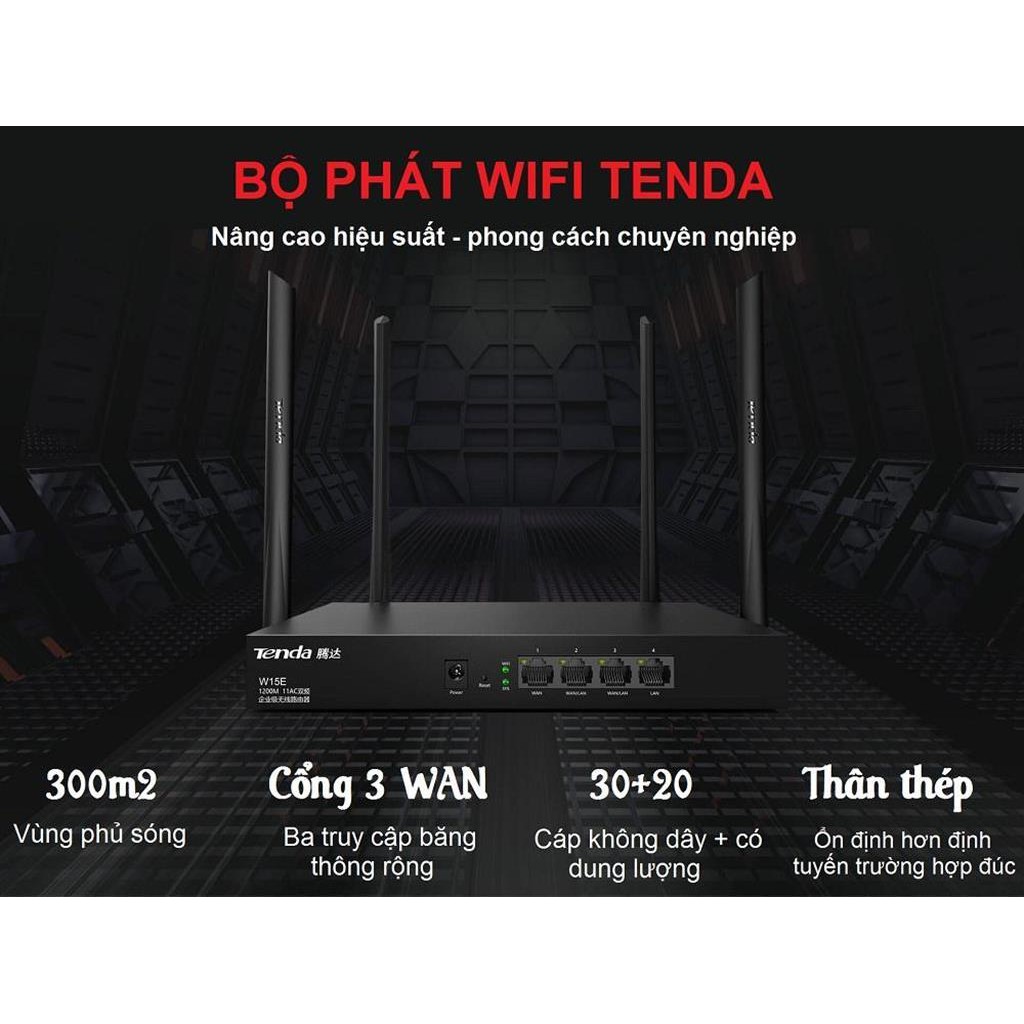 Bộ phát WIFI Tenda W15e ac1200Mps mạng doanh nghiệp 50 user - vùng phủ sóng 300m2 - nhập khẩuTốc độ không dây lên tới 1200Mbps với 2 băng tầng kép 2.4G và 5Ghz