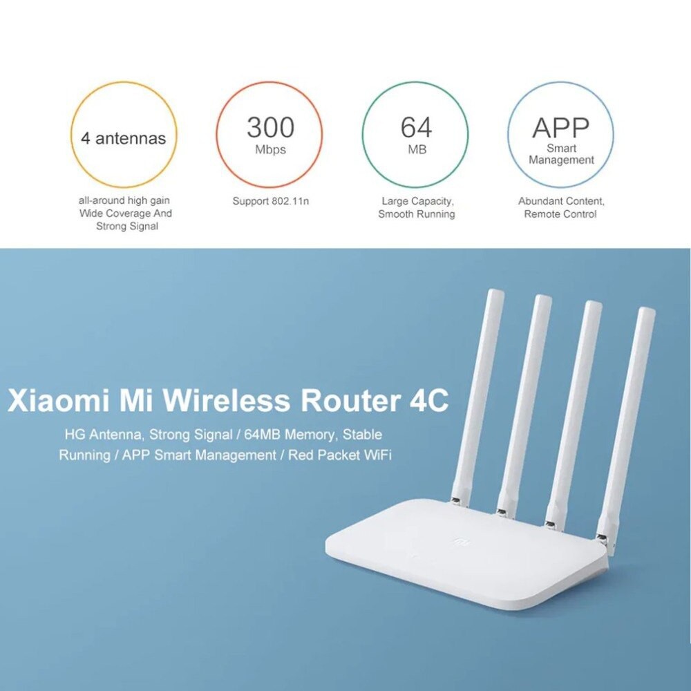 Bộ phát Wifi - Router Wifi Xiaomi 4C-4 AntenĐể có mức giá hấp dẫn hơn và dễ tiếp cận người dùng hơn, bên cạnh những sản phẩm chủ đạo của năm, Xiaomi luôn tung ra những phiên bản rút gọn về mặt tính năng. Xiaomi Router Wifi 4C là một trong số đó, sản phẩm là phiên bản rút gọn của router gen 4 mới được ra mắt đầu năm 2018.