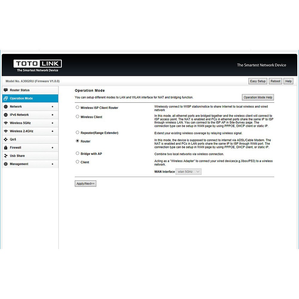 Đón đầu xu hướng nhu cầu sử dụng các sản phẩm giải trí đa phương tiện trong gia đình hiện nay, không chỉ là việc sử dụng wifi mạng internet, TotoLink A3002RU được trangTính năng Multi VLAN cho khả năng truyền tải các ứng dụng xem tivi trực tuyến hiện nay là MyTV, NetTV, IPTV ngay trong một thiết bị, giảm thiểu việc trang bị quá nhiều modem gấy khó khăn trong lăp đặt. Bên cạnh đó, thiết bị vẫn mang tới cho bạn đầy khả năng phát sóng wifi hiệu quả với WiFi chuẩn B,G,N và AC. Upto 1167Mbps, NAT Sessions cao đến 20.000 (30 ~ 50 PC), Phát 3 SSID cho mỗi băng tầng 2.4Ghz và 5Ghz, 20 Clients wifi cho mỗi băng tầng (20 cho 2.4Ghz và 20 cho 5Ghz) kết nối cùng lúc.