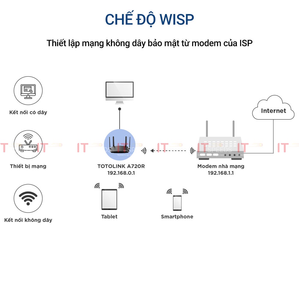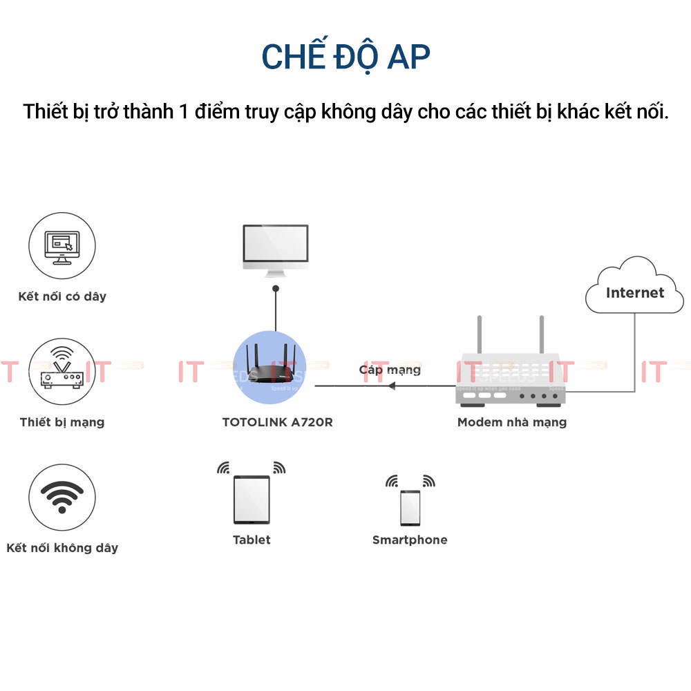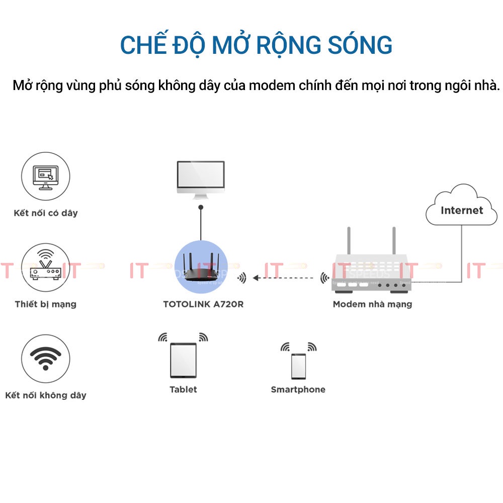 Bộ Phát Wifi Totolink A720R, Router Băng Tần Kép AC1200, 2.4GHz Và 5GHz, 4 Ăng Ten Công Suất Cao, Chính Hãng BH 24 ThángTương thích chuẩn Wi-Fi tiên tiến IEEE 802.11a/b/g/n/ac