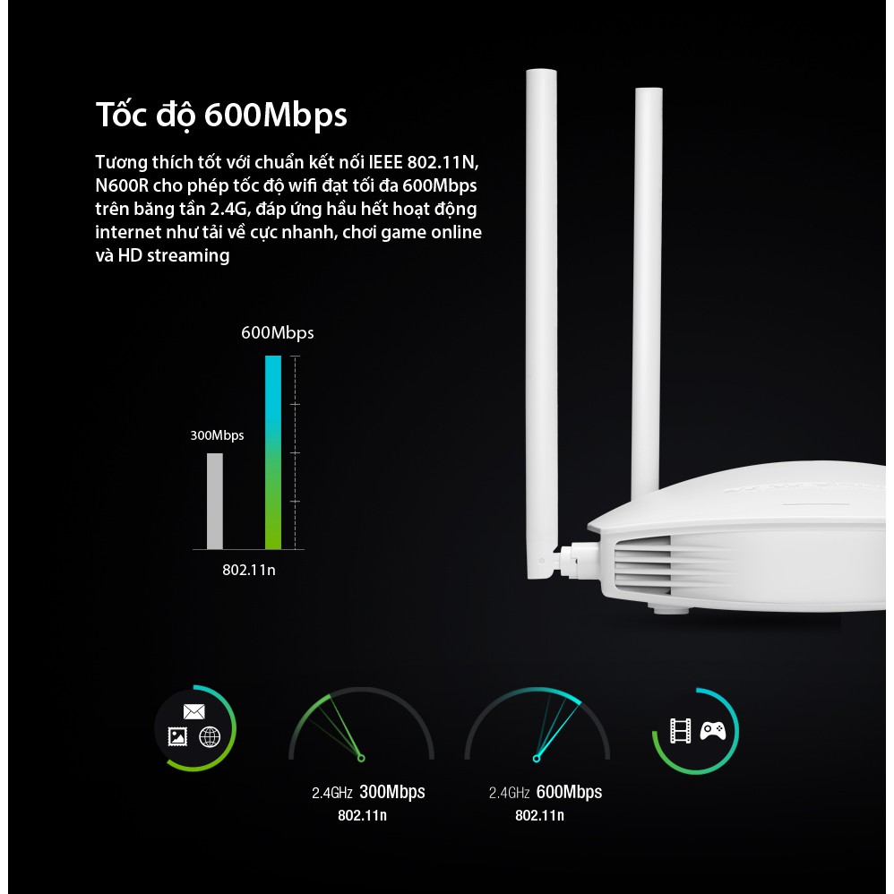 ❖ N600R cho phép tốc độ Wifi đạt tối đa 600Mbps trên băng tần 2.4G, đáp ứng hầu hết hoạt động internet