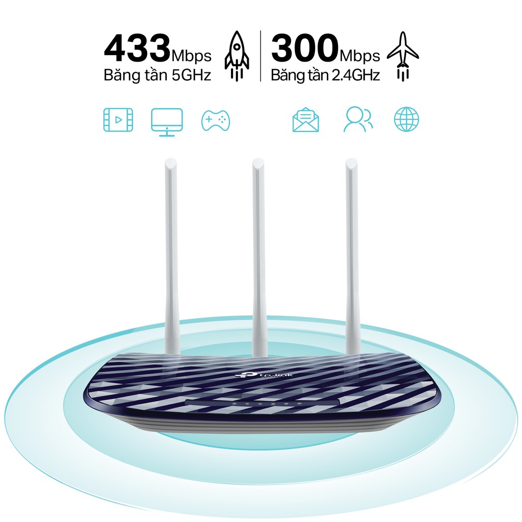 - Kết nối băng tần kép tốc độ 750Mbps: Với 2 băng tần 5GHz và 2.4GHz, Archer C20 cung cấp sự linh hoạt và đảm bảo hiệu suất wifi tuyệt vời. Các tác vụ đơn giản như gửi e-mail hoặc duyệt web có thể được xử lý bởi băng tần 2.4GHz, trong khi các tác vụ tiêu tốn nhiều băng thông như chơi game online, hoặc phát video HD có thể được xử lý bởi băng tần 5GHz.
