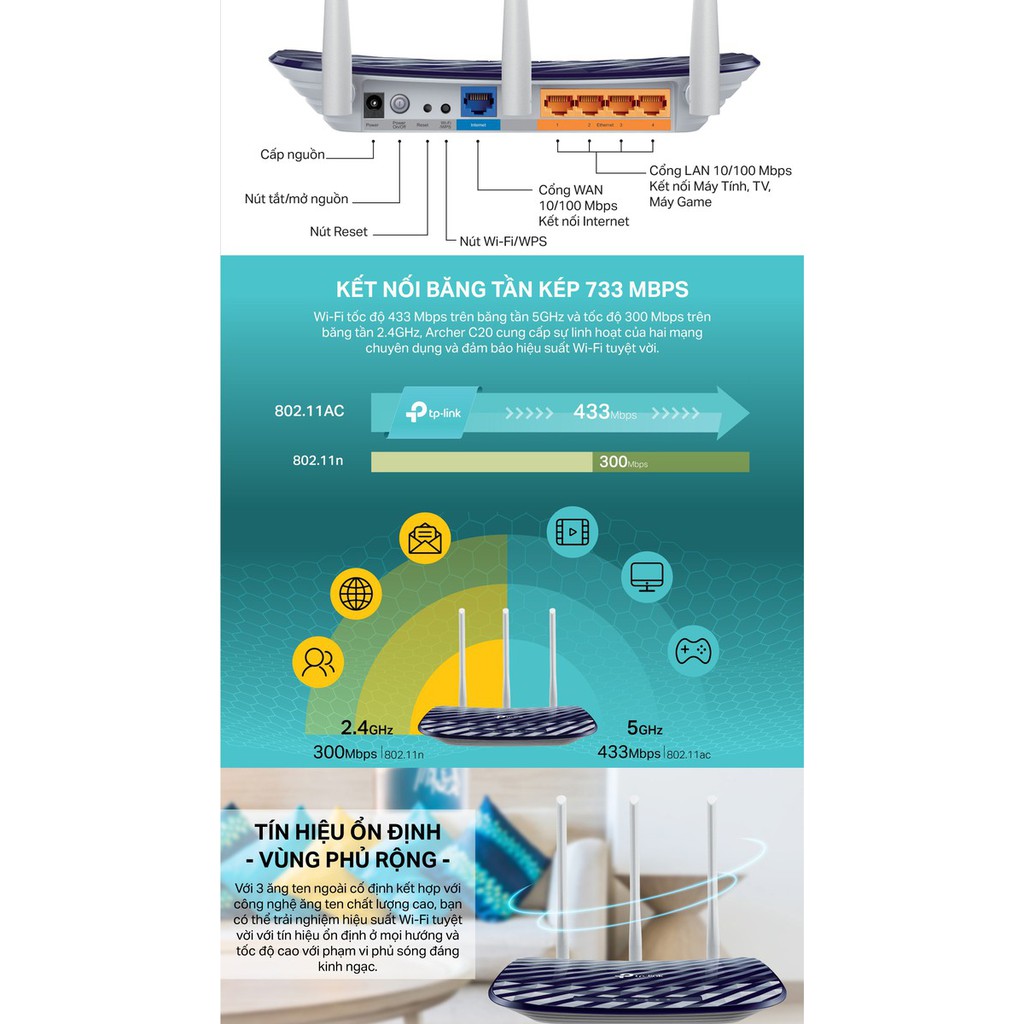 - Tốc độ tín hiệu : 5GHz: lên đến 433Mbps , 2.4GHz: lên đến 300Mbps