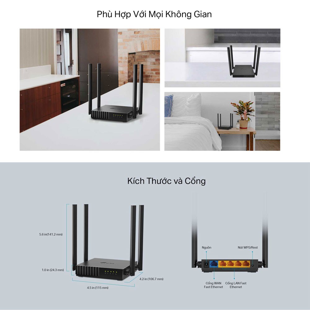- Wi-Fi băng tần kép AC1200 lý tưởng cho việc phát video 4K và tải về tốc độ cao.