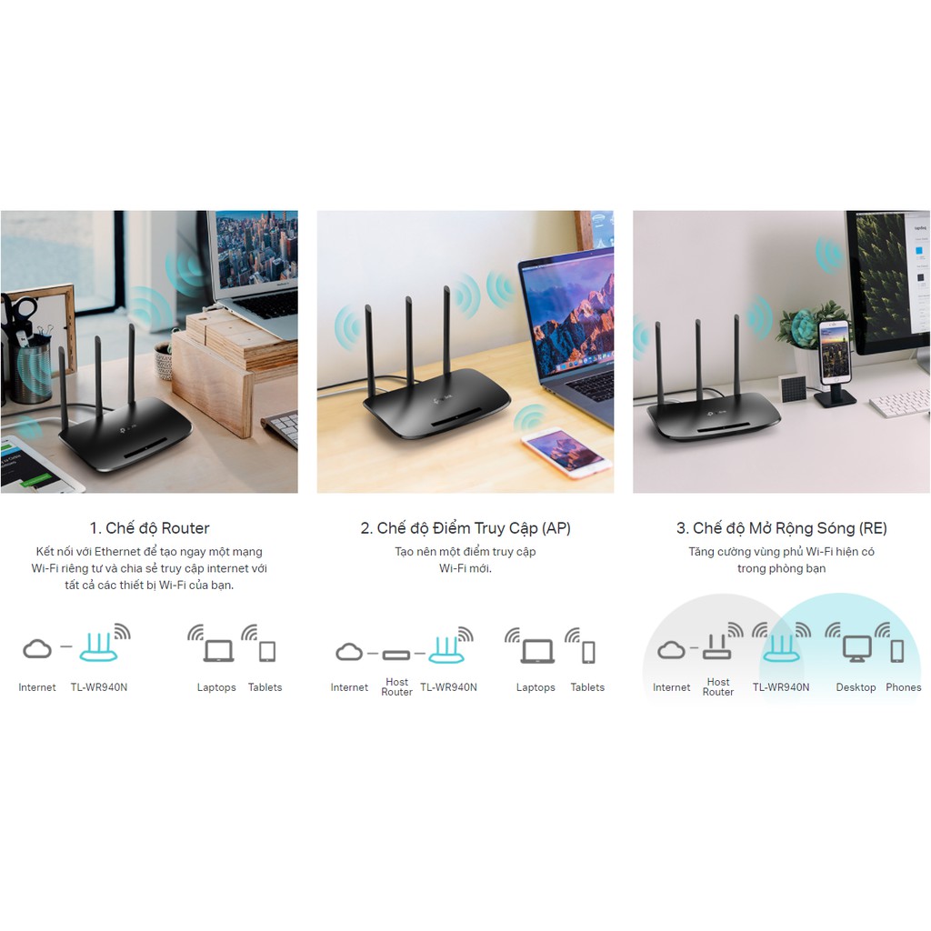 Hỗ trợ 3 chế độ: Router, Mở rộng sóng (RE) và Điểm Truy Cập (AP)
