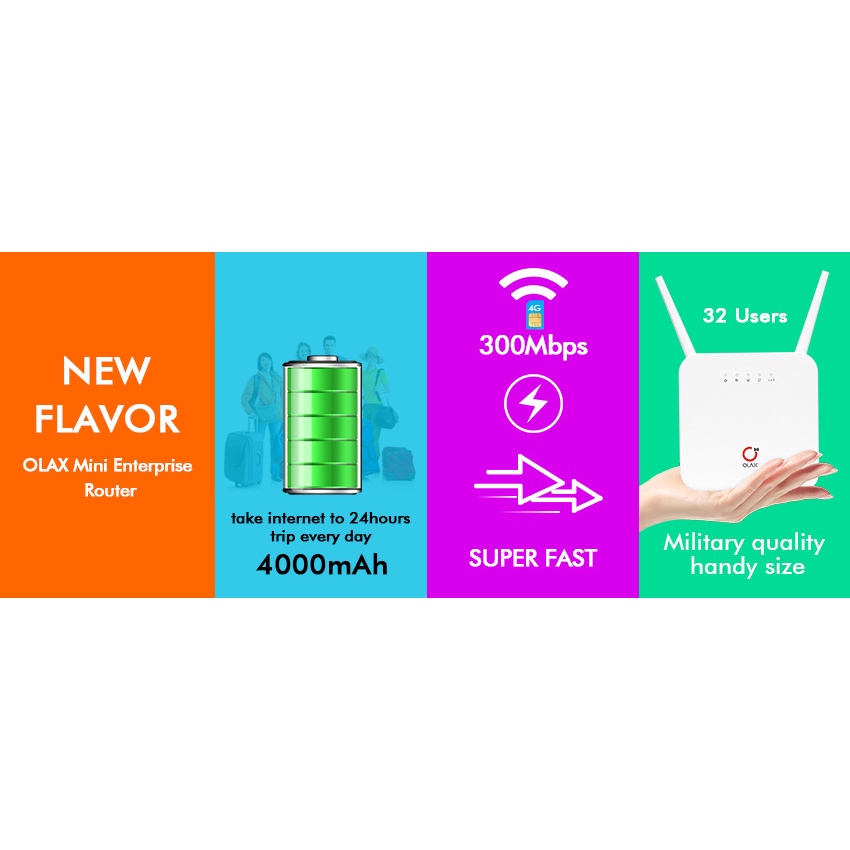 Bộ phát wifi từ sim 3G 4G OLAX AX6 pro công suất lớn cắm điện hoạt động 24/24 , hoặc sử dụng pin đi kèm dung lượng 4000MahTốc độ Wifi lên tới 300 Mbps