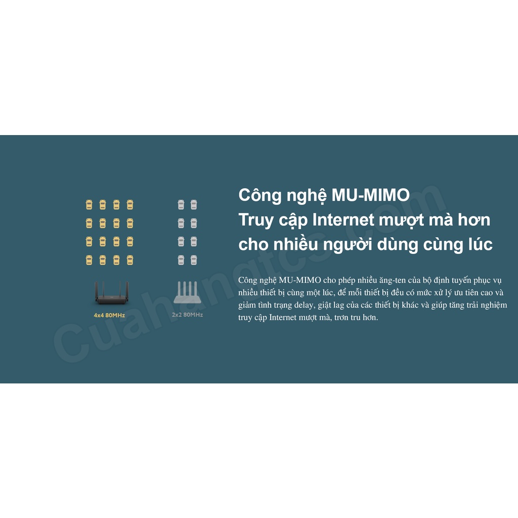 Hai băng tần 2.4GHz và 5GHz. Hai băng tần không gây nhiễu lẫn nhau và về lý thuyết có tốc độ mạng kết hợp lên đến 3202Mbps. Tận hưởng khả năng truy cập internet cực nhanh, vùng phủ sóng tín hiệu ổn định, sử dụng tốc độ cao và video HD hoàn hảo cũng như chơi game trực tuyến trên quy mô lớn.