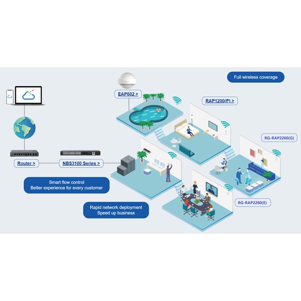 - Hỗ trợ dịch vụ Ruijie Cloud miễn phí cho phép cấu hình nhanh, đơn giản, quản lý và giám sát dễ dàng