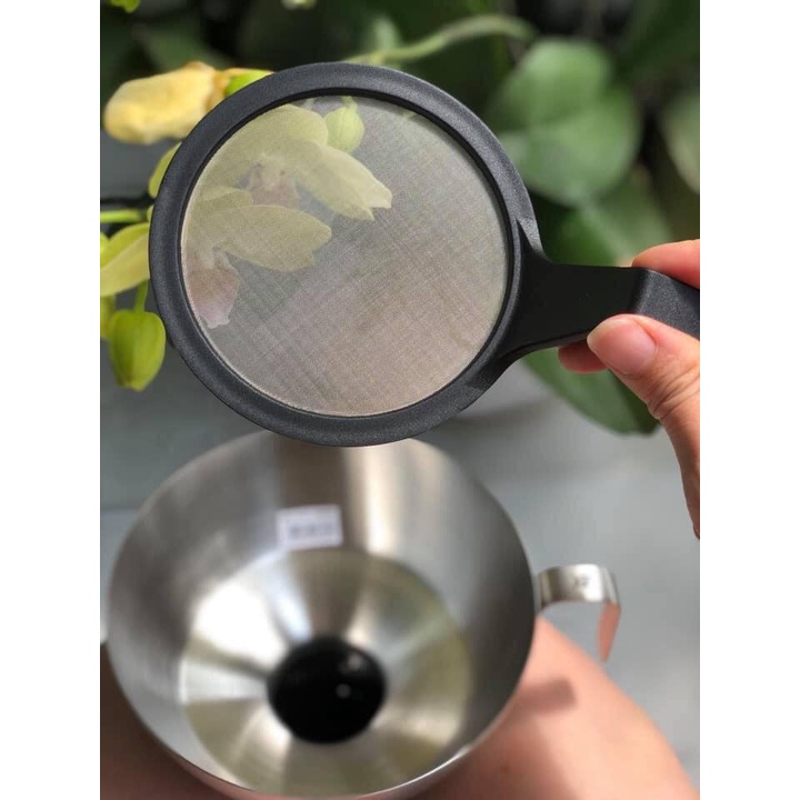 - Phễu inox to (đường kính 18cm, rất rộng, thoải mái đổ cả bã lẫn nước vào để lọc).
