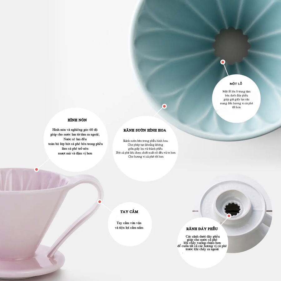 Nhờ các vân hoa dọc thành phễu, lớp không khí được giữ lại vừa đủ giữa giấy lọc phễu, giúp cà phê được chiết xuất hiệu quả.