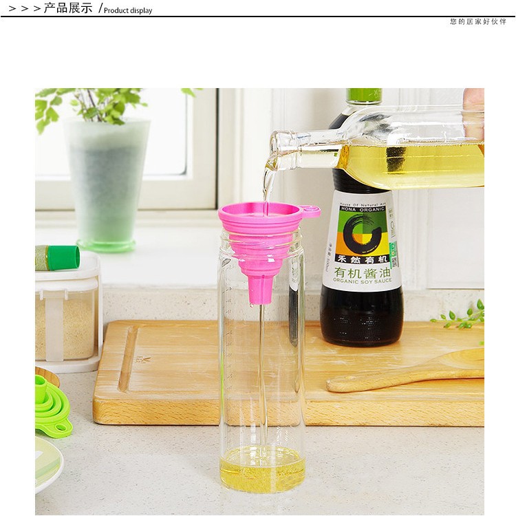 Phễu silicon gấp gọn tiện dụngPhễu là một vật dụng rất phổ biến và vô cùng cần thiết của các gia đình; được sử dụng với nhiều mục đích khác nhau: chiết dầu ăn, mắm, tương, mật ong... ra chai nhỏ thuận tiện cho việc sử dụng hằng ngày; đổ nước cam, nước ép,... vào chai để mang theo đi học đi làm.Phễu silicon so với phễu nhựa truyền thống gần như nhau, đồng thời có rất nhiều ưu điểm:Vẫn chịu được nhiệt độ rất cao tới 230 độ CDễ dàng và an toàn cho việc chùi rửa hằng ngày, không để lại vệt khó chịuSau khi sử dụng có thể gấp gọn lại, không tốn diện tích