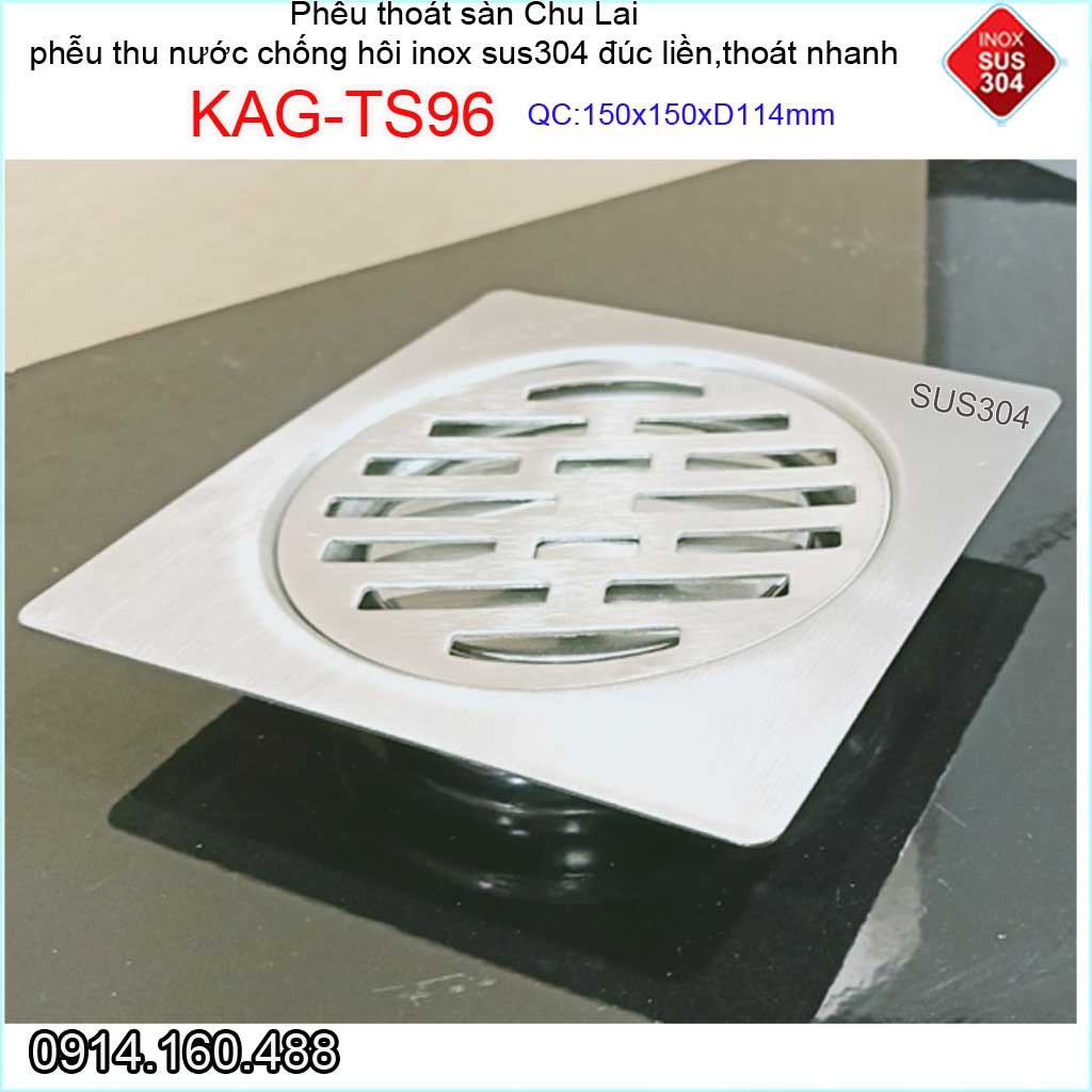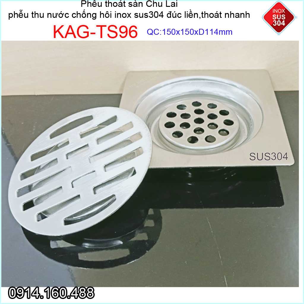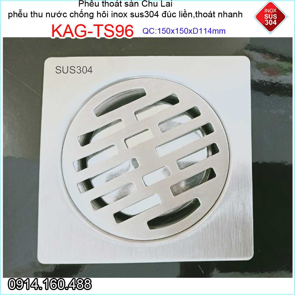 Phễu thoát nước chống hôi 15x15cm KAG-TS96-D114, Thoát sàn Chu Lai ống 11.4cm SUS304 inox đúc dày thoát nhanh chặn tóc t