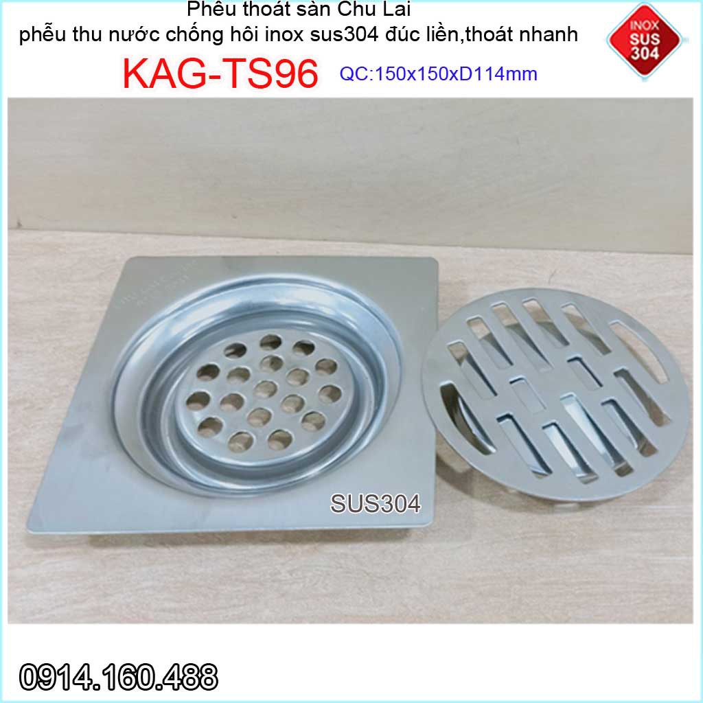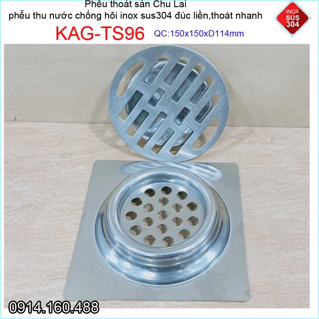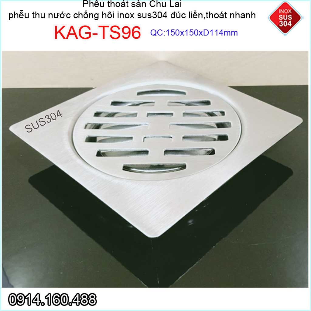 Phễu thoát nước chống hôi 15x15cm KAG-TS96-D114, Thoát sàn Chu Lai ống 11.4cm SUS304 inox đúc dày thoát nhanh chặn tóc t