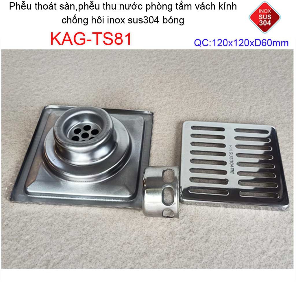 Phễu thoát sàn 12x12cm KAG-TS81(D60cm) inox 304 ga thoát sàn12x12cm cho ống 60mm, thoát sàn mặt sọc thoát nhanh chặn tóc tốtKích thước 120mmx120mm ống D60mm