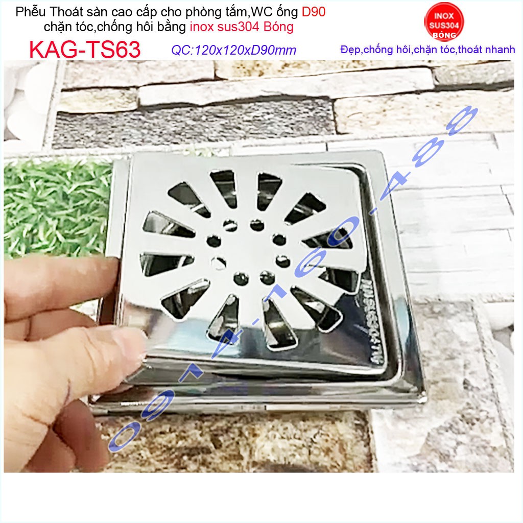 Giới thiệu Phễu thoát sàn 12x12cm KAG-TS63 (D9cm) chống mùi hôi inox 304, hố ga thoát sàn 12x12cm cho ống D90mm mặt hoa cúc chống m
