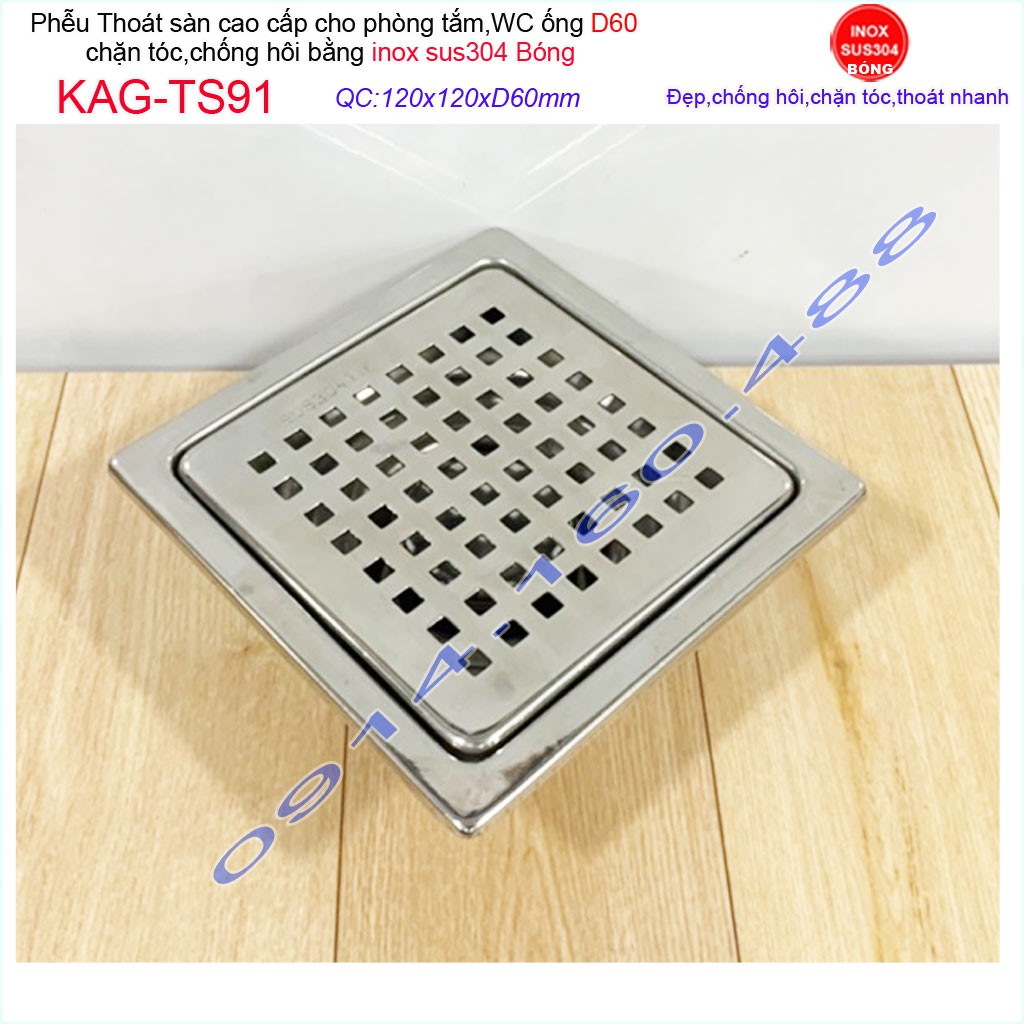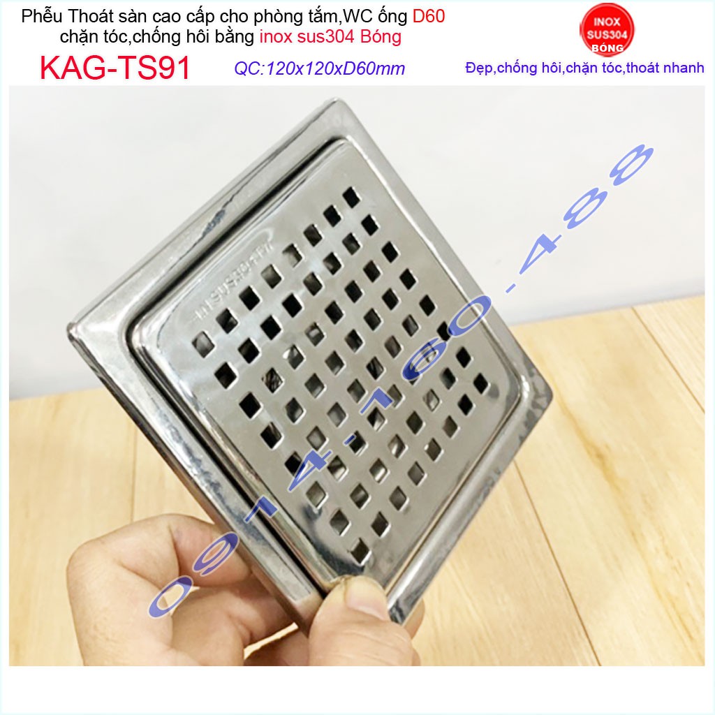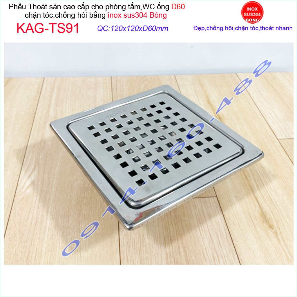 Giới thiệu Phễu thoát sàn 12x12cm KAG-TS91 (D6cm) inox 304, hố ga thoát sàn khách sạn cho ống D60mm mặt caro chống mùi hôi thoát n