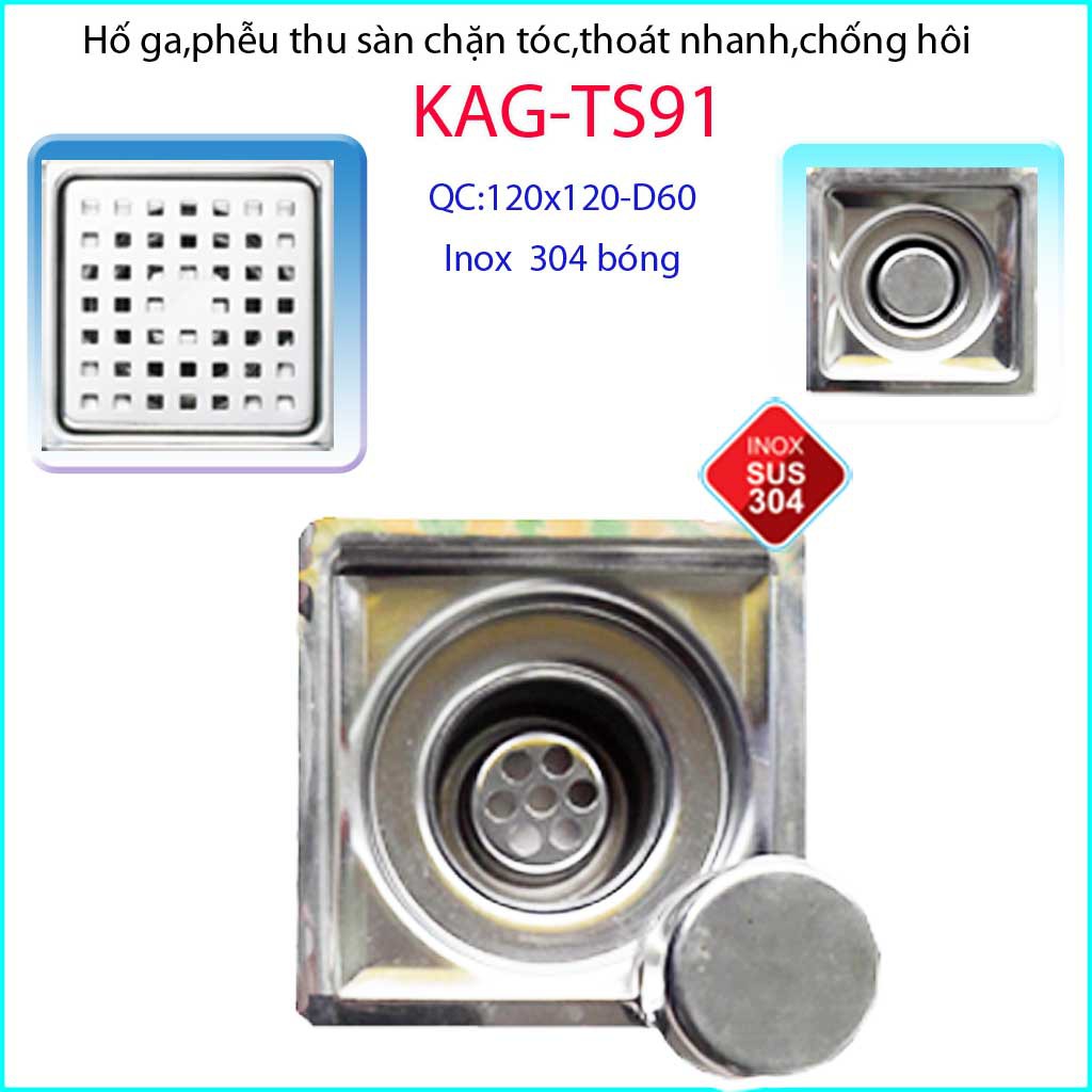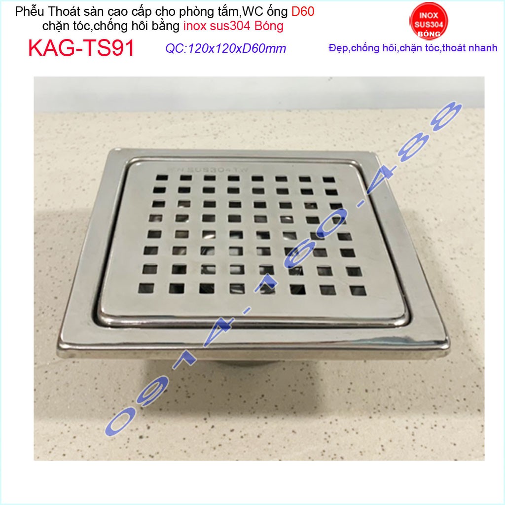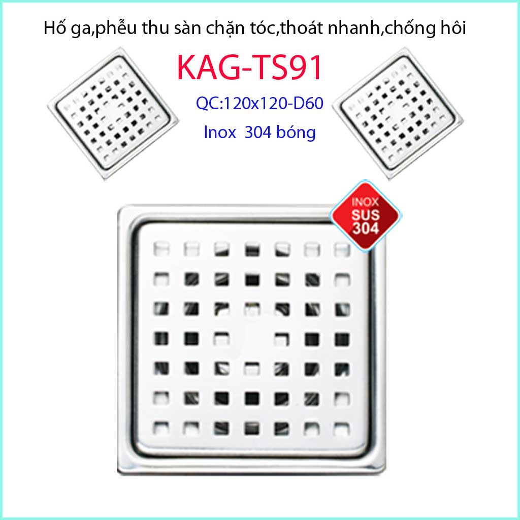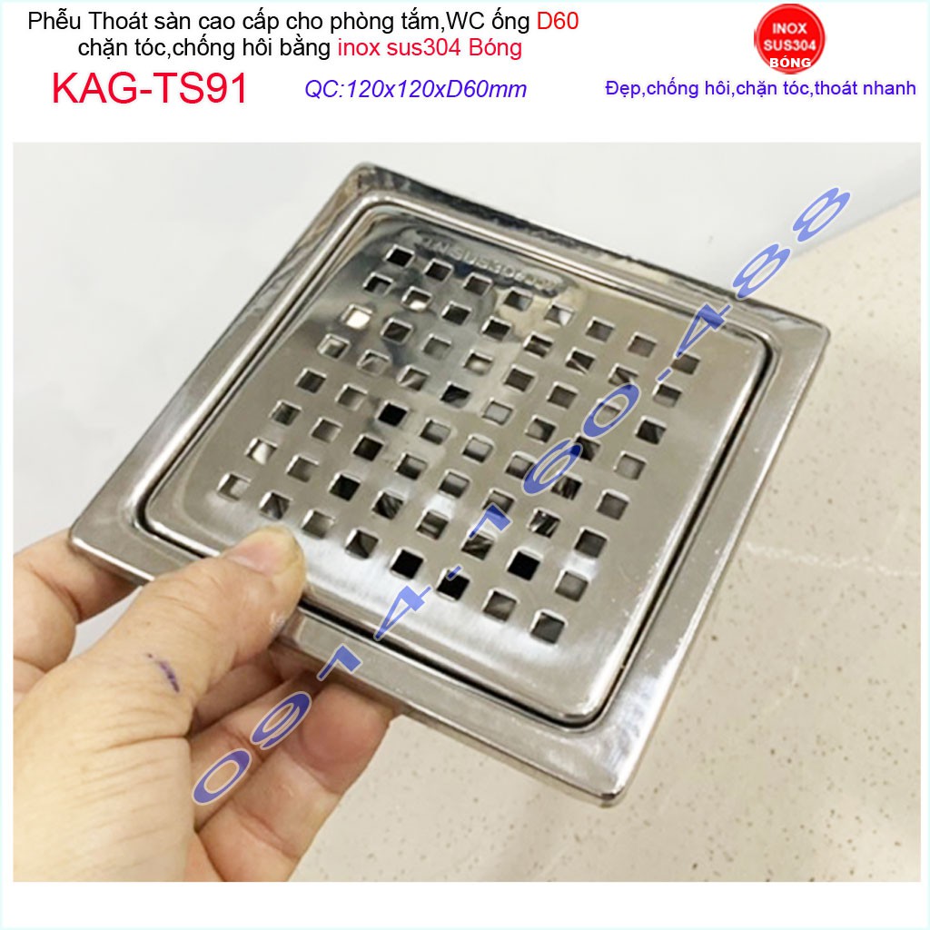 Giới thiệu Phễu thoát sàn 12x12cm KAG-TS91 (D6cm) inox 304, hố ga thoát sàn khách sạn cho ống D60mm mặt caro chống mùi hôi thoát n
